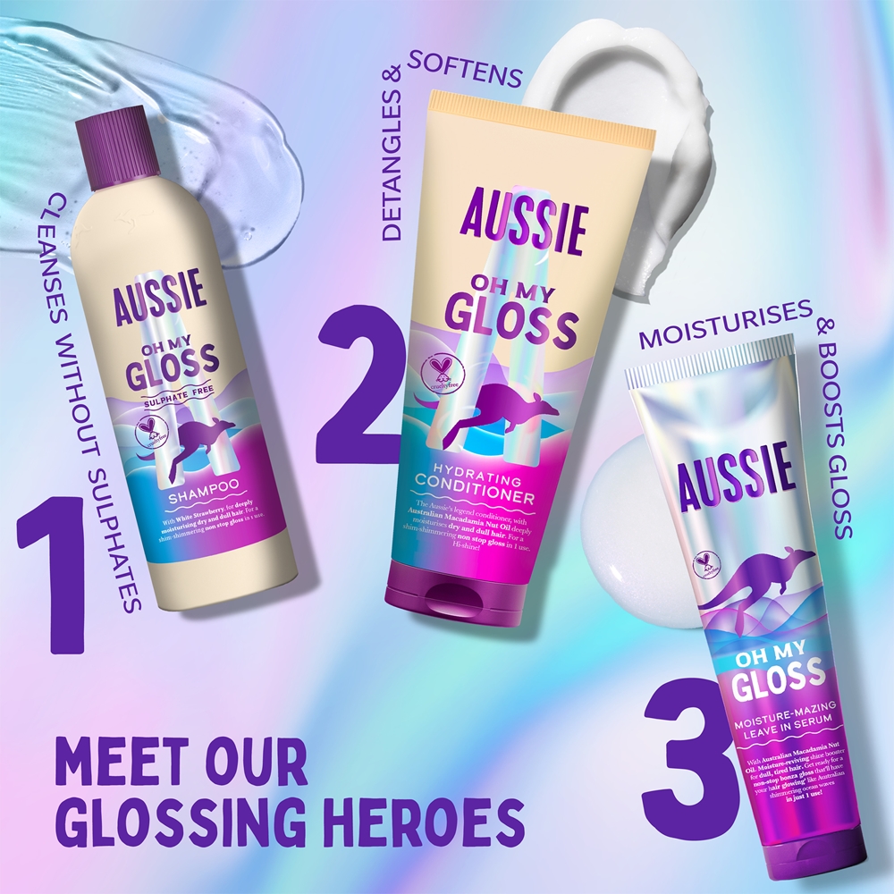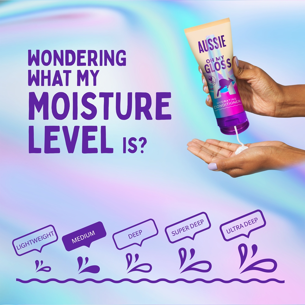 Ao lavar o cabelo, o champô abre a estrutura superficial do cabelo – a cutícula. Por isso, é importante dar ao seu cabelo um tratamento após a lavagem para voltar a fechar a cutícula. E é disso que o condicionador Aussie Oh My Gloss Hydrating Conditioner se encarrega. Para além de selar as fibras capilares, assegura a sua nutrição, hidratação e suavização, sem as quais não pode passar um cabelo bonito, brilhante e saudável. Vai protegê-lo contra os danos mecânicos e a secura, alisar ainda mais a sua superfície e ajudar a suavizá-lo, tornando-o mais fácil de pentear e de ajustar.