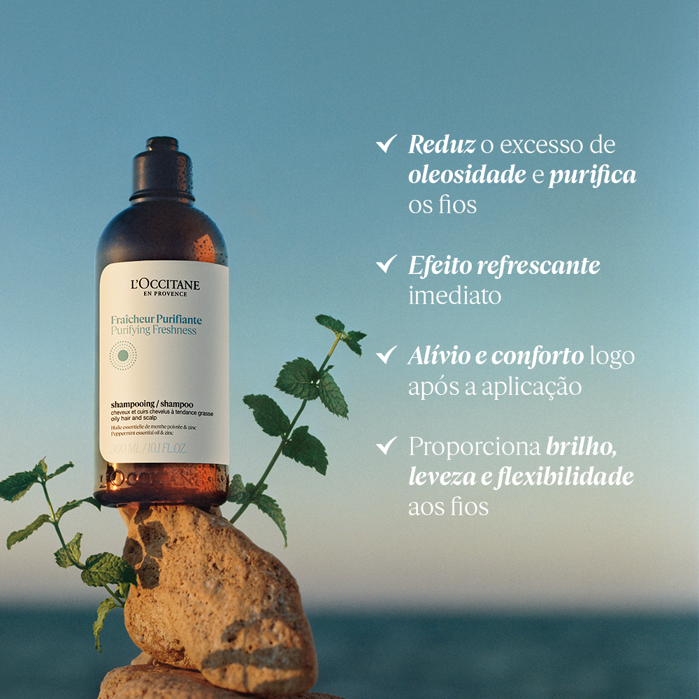 O Champô Pura Frescura Aromacologia da L’Occitane refresca o couro cabeludo e reduz o excesso de sebo, para um cabelo limpo e fresco, purifica o couro cabeludo e as raízes, proporciona um efeito refrescante e reduz os maus odores.