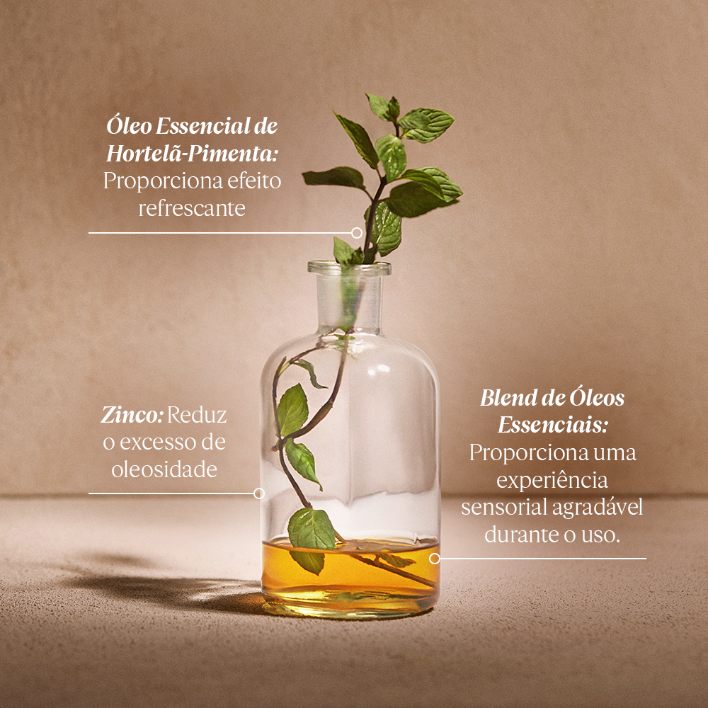Ideal para cabelos oleosos, é rico em óleo essencial de hortelã-pimenta e zinco, que reduzem visivelmente a produção de sebo e oferecem um efeito refrescante instantâneo.